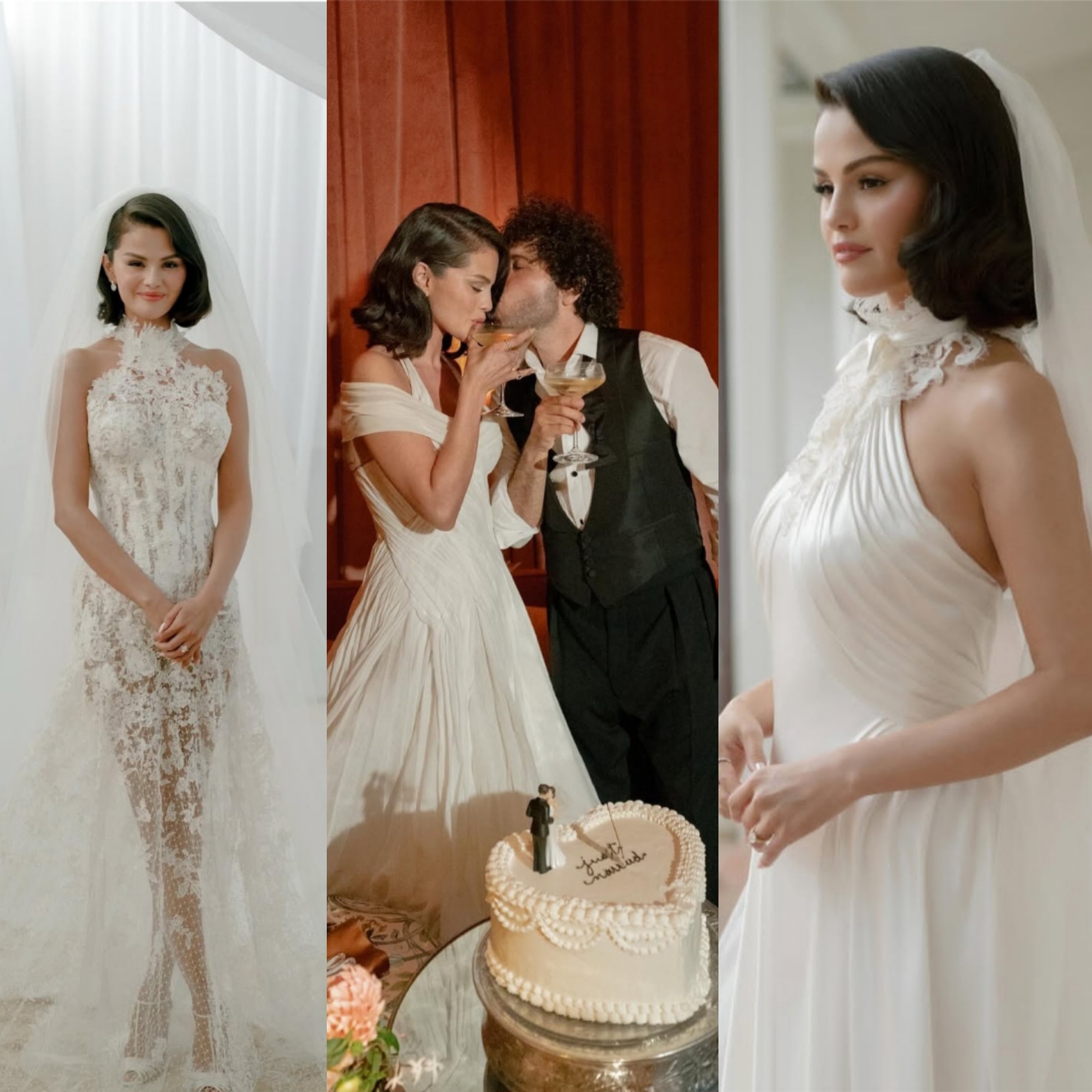 Selena Gomez is sharing new glimpses into her and Benny Blanco's elegant wedding. The singer and actress, 33, shared intimate photos from the couple's big day in an Instagram post on Tuesday, Sept. 30, giving the first look at her wedding reception dress. She first wore a halter-neck Ralph Lauren wedding ceremony gown, complete with lace detailing at the neck and a long train. Gomez accessorized with a simple long veil and wore her hair parted to the side in Old Hollywood-style waves.