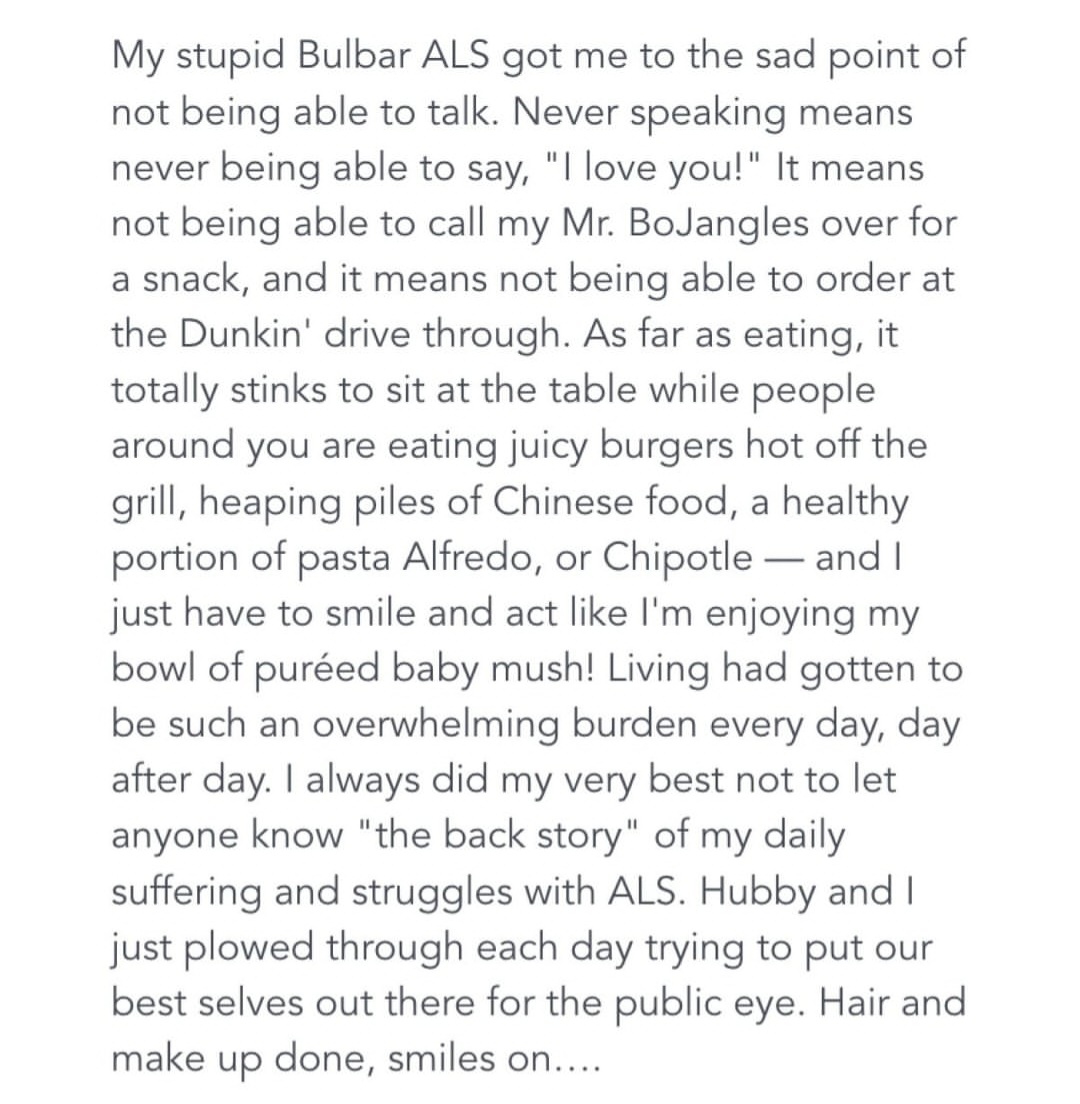 “Living had gotten to be such an overwhelming burden every day, day after day,” Murphy confessed. “I always did my very best not to let anyone know ‘the back story’ of my daily suffering and struggles with ALS. Hubby and I just plowed through each day trying to put our best selves out there for the public eye.”